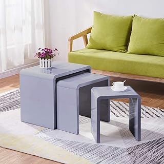 GOLDFAN Lot de 3 Table Basse Gigognes Bois Moderne Haute Brillance Table Basse Laquée pour Salon, Multifonctionnelle Table d'appoint Carré, Gris